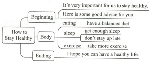 As we all know,it's very important for us to stay healthy. If you don't pay attention to it,you will fall ill easily. Here is some good advice for you. Firstly,have a balanced diet. You should eat more fruits and vegetables. They are good for your health. And remember not to eat much junk food. Secondly,get enough sleep. Teenagers should sleep for about eight hours every night. Don't stay up late. It's harmful to your health. Thirdly,take more exercise. In your spare time,you need to take part in different kinds of indoor or outdoor activities. Finally,stay away from cigarettes.