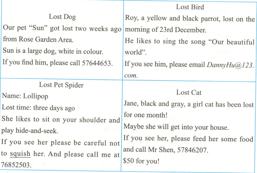 ) 3. lost a yellow and black parrot.A. Sam Chen