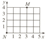 1. 方格纸上有 $ M $,$ N $ 两点,如图所示,若以点 $ N $ 为原点建立平面直角坐标系,则点 $ M $ 的坐标为 $ (3,4) $;若以点 $ M $ 为原点建立平面直角坐标系,则点 $ N $ 的坐标为 (