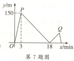 7. 已知A,B两地相距$1200$m,甲和乙两人均从A地出发,向B地匀速运动,先到达终点的人停止运动.已知甲比乙先出发$3$min.如图所示,这是甲、乙两人之间的距离$y$(m)和甲出发的时间$x$(min)之间的关系,下列结论正确的是(