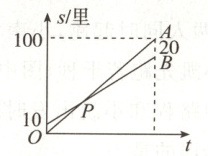 5. 我国古代数学著作《九章算术》中记载:“今有不善行者先行一十里,善行者追之一百里,先至不善行者二十里.问善行者几何里及之.”意思是不善行者先走$10$里路,善行者追他,当善行者走到$100$里路时,超过了不善行者$20$里路.善行者走到多少里路时就赶上了不善行者?如图所示,这是善行者与不善行者行走路程$s$(单位:里,$1$里$=500$m)关于善行者的行走时间$t$的函数图象,则两图象的交点$P$的纵坐标是(