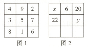 5. 幻方是古老的数学问题,我国古代的《洛书》中记载了最早的幻方——九宫格. 将 9 个数填入幻方的空格中,要求每一横行、每一竖列以及两条对角线上的 3 个数之和相等,例如图 1 就是一个幻方,图 2 是一个未完成的幻方,则 $ x $ 与 $ y $ 的积是