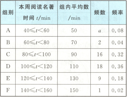 ,本周阅读名著时间的中位数落在D或100≤t<120