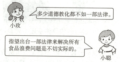 (3)①法律是由国家强制力保证实施的,对全体社会成员具有普遍约束力。出台反食品浪费法能够发挥法律的规范、指引、教育作用,有效制约食品浪费行为。②反对食品浪费还要重视发挥道德的教化作用。以法治承载道德理念,以道德滋养法治精神,使二者相辅相成、相得益彰。③反对食品浪费除了科学立法之外,还需要公正司法、严格执法、全民守法。④反对食品浪费还需要在全社会形成节约光荣、浪费可耻的文化环境。⑤实行良法善治。