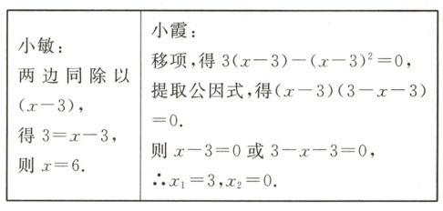 7.解:小敏:×;小霞:×。正确的解答:移项,得$3(x - 3)-(x - 3)^2=0$,提取公因式,得$(x - 3)(3 - x + 3)=0$。则$x - 3=0$或$3 - x + 3=0$,$\therefore x_1=3,x_2=6$。