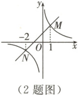 2. (2023·宁夏)如图,函数 $ y_1 = x + 1 $ 与函数 $ y_2 = \frac{2}{x} $ 的图象相交于点 $ M(1,m) $,$ N(-2,n) $。若 $ y_1 > y_2 $,则 $ x $ 的取值范围是(