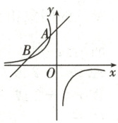 9. (2023·岳阳)如图,一次函数 $ y = x + 5 $ 的图象与反比例函数 $ y = \frac{k}{x} $($ k $ 为常数且 $ k \neq 0 $)的图象相交于 $ A(-1,m) $,$ B $ 两点。