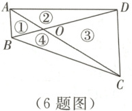 6. 如图,四边形$ABCD$的对角线$AC$,$BD$相交于点$O$,且将这个四边形分成①②③④四个三角形. 若$OA:OC = OB:OD$,则下列结论中一定正确的是(
