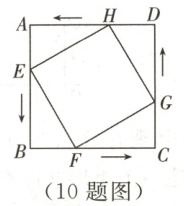 10. 如图,在边长为$6cm$的正方形$ABCD$中,点$E$,$F$,$G$,$H$分别从点$A$,$B$,$C$,$D$同时出发,均以$1cm/s$的速度向点$B$,$C$,$D$,$A$匀速运动。当点$E$到达点$B$时,四个点同时停止运动,在运动过程中,当运动时间为