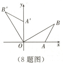 8. (2023·枣庄)如图,平面直角坐标系中,点B在第一象限,点A在x轴的正半轴上,∠AOB=∠B=30°,OA=2。将△AOB绕点O逆时针旋转90°,点B的对应点B′的坐标是(