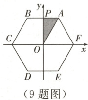 9. (2024·河南)如图,在平面直角坐标系中,边长为2的正六边形ABCDEF的中心与原点O重合,AB//x轴,交y轴于点P。将△OAP绕点O顺时针旋转,每次旋转90°,则第2022次旋转结束时,点A的坐标为(