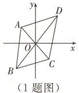 1. (对称中心为原点)如图,在 $ □ ABCD $ 中,$ AC $ 与 $ BD $ 交于点 $ O $,$ O $ 为坐标原点。若点 $ D $ 的坐标为 $ (2,3) $,则点 $ B $ 的坐标是