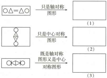 6. 以给出的图形“○、○、△、△、=”(两个相同的圆、两个相同的三角形、两条平行线)为构件,各设计一个构思独特且有意义的轴对称图形和中心对称图形。举例:如图所示,左框中是符合要求的一个图形。你还能构思出其他的图形吗?请在右框中画出与之不同的图形。