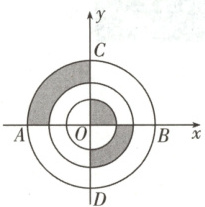 1. 如图所示,三圆同心于 $ O $,$ AB = 4 cm $,$ CD \perp AB $于 $ O $,则图中阴影部分的面积为