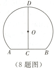 8. (2024·青海)如图是一个隧道的横截面,它的形状是以点 $ O $ 为圆心的圆的一部分,如果 $ C $ 是 $ \odot O $ 中弦 $ AB $ 的中点,$ CD $ 经过圆心 $ O $ 交 $ \odot O $ 于点 $ D $,并且 $ AB = 4 m $,$ CD = 6 m $,则 $ \odot O $ 的半径长为