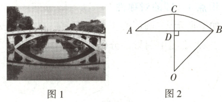 13. (2024·宜昌)石拱桥是我国古代人民勤劳和智慧的结晶(如图 1),隋代建造的赵州桥距今约有 1400 年历史,是我国古代石拱桥的代表。如图 2 是根据某石拱桥的实物图画出的几何图形,桥的主桥拱是圆弧形,表示为 $ \overset{\frown}{AB} $。桥的跨度(弧所对的弦长)$ AB = 26 m $,设 $ \overset{\frown}{AB} $ 所在圆的圆心为 $ O $,半径 $ OC \perp AB $,垂足为 $ D $。