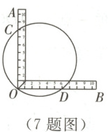 7. 在数学实践活动课中,小辉利用自己制作的一把“直角角尺”测量、计算一些圆的直径.如图,∠AOB=90°,将点O放在圆周上,分别确定OA,OB与圆的交点C,D,读得数据OC=8,OD=6,则此圆的直径为(