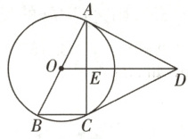 3. 如图,在四边形 $ABCD$ 中,$AB = AD = CD$,以 $AB$ 为直径的 $\odot O$ 经过点 $C$,连接 $AC$,$OD$ 相交于点 $E$,$AC = 2BC$。求证:$DC$ 与 $\odot O$ 相切。