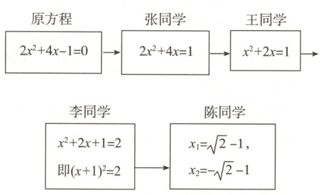 2. 数学课上,数学老师在黑板上写出了一个一元二次方程,让第一学习小组的四名同学以接力的方式用配方法解这个方程,每人负责完成一个步骤(如图所示),每完成一步解答后,下一名同学进行计算……依次进行,最后完成计算。规则是每人只能看到前一名同学的计算结果。下面的接力计
