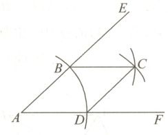 4. 如图所示,已知$\angle A$,以点$A$为圆心,适当长为半径画弧,分别交$AE$,$AF$于点$B$,$D$,继续分别以点$B$,$D$为圆心,线段$AB$的长为半径画弧,两弧交于点$C$,连接$BC$,$CD$,则所得四边形$ABCD$为菱形,判定依据是