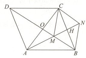 9. 如图所示,在平行四边形$ABCD$中,对角线$AC$,$BD$相交于点$O$,$M$是$BD$上任意一点,连接$AM$并延长至点$N$,使$AM = MN$,交$BC$于点$H$,连接$CN$,$BN$。