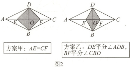 3. 如图 1 所示,在菱形 $ABCD$ 中,对角线 $AC$,$BD$ 相交于点 $O$,要在对角线 $AC$ 上找两点 $E$,$F$,使得四边形 $BFDE$ 是菱形,现有如图 2 所示的甲、乙两种方案,则正确的方案是(