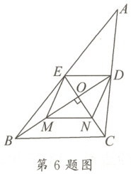 6. 如图所示, 在 $\triangle ABC$ 中, $BD$, $CE$ 分别是边 $AC$, $AB$ 上的中线, $BD\perp CE$ 于点 $O$, $M$, $N$ 分别为 $OB$, $OC$ 的中点. 若 $OB = 8$, $OC = 6$, 则四边形 $DEMN$ 的周长是(