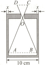 6. 如图所示,这是一个零件的剖面图,已知零件的外径为$10\mathrm{cm}$,为求出它的厚度$x$,现用一个交叉卡钳($AC$和$BD$的长相等)去测量零件的内孔直径$AB$。如果$\frac{OC}{OA}=\frac{OD}{OB}=\frac{1}{3}$,且量得$CD$的长是$3\mathrm{cm}$,那么零件的厚度$x=$