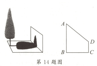14. 为了测得一棵树的高度$AB$,一个小组的同学进行了如下测量:在阳光下,测得一根与地面垂直、长为$1m$的竹竿的影长为$0.8m$,同时发现这棵树的影子不全落在地面上,有一部分影子落在教学楼的墙壁上(如图所示),测得墙壁上的影长$CD$为$1.5m$,落在地面上的影长$BC$为$3m$,则这棵树的高度$AB$为