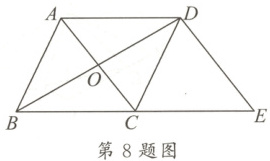 8. 在菱形 $ABCD$ 中, 对角线 $AC$, $BD$ 相交于点 $O$, $AB = 5$, $AC = 6$, 过点 $D$ 作 $AC$ 的平行线, 交 $BC$ 的延长线于点 $E$, 则 $\triangle BDE$ 的面积为(