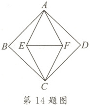 14. 如图所示, 正方形 $ABCD$ 的面积为 $4$, 菱形 $AECF$ 的面积为 $2$, 则 $EF$ 的长是