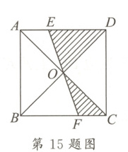 15. 如图所示, 边长为 $2$ 的正方形 $ABCD$ 的对角线相交于点 $O$, 过点 $O$ 的直线分别交 $AD$, $BC$ 于点 $E$, $F$, 则阴影部分的面积是