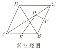 9. 如图所示, 在菱形 $ABCD$ 中, 对角线 $AC = 8$, $BD = 6$, $E$, $F$ 分别是边 $AB$, $BC$ 的中点, 点 $P$ 在 $AC$ 上运动, 在运动过程中, $PE + PF$ 存在最小值, 则这个最小值是(