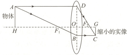 6. 凸透镜成像的原理如图所示,AD//HG//BC,若焦点 $ F_1 $ 到物体的距离与焦点 $ F_1 $ 到凸透镜中心线 DB 的距离之比为 5:2,则物体被缩小到原来的
