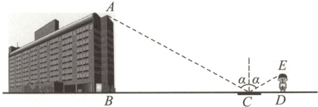 9. 小军想出了一个测量建筑物高度的方法:在地面上点 C 处平放一面镜子,并在镜子上做一个标记,然后向后退去,直至站在点 D 处恰好看到建筑物 AB 的顶端 A 在镜子中的像与镜子上的标记重合(如图所示). 设小军的眼睛距地面 1.65m,BC,CD 的长分别为 60m,3m,求这座建筑物的高度.