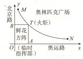 17. (8分)如图所示,奥运火炬抵达某市奥林匹克广场后,沿图中直角坐标系中的一段反比例函数图象传递.动点$T(s,t)$表示火炬的位置,火炬从离北京路$10\ m$处的$M$点开始传递,到离北京路$1000\ m$的$N$点时传递活动结束.临时指挥部设在坐标原点$O$(北京路与奥运路的十字路口),$OATB$为鲜花方阵,方阵始终保持矩形形状且面积恒为$10000\ m^2$(路线宽度均不计).