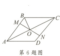 6. 如图所示,在菱形 $ABCD$ 中,$M,N$ 分别在 $AB,CD$ 上,且 $AM = CN,MN$ 与 $AC$ 交于点 $O$,连接 $BO$. 若 $\angle DAC = 25^{\circ}$,则 $\angle OBC$ 的度数为(