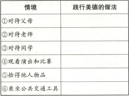 13. (情境化Ⅲ)美德的力量在于践行。中学生践行美德要与日常生活紧密联系。请把中学生在下列生活情境中践行美德的正确做法写出来,并与同学交流分享。