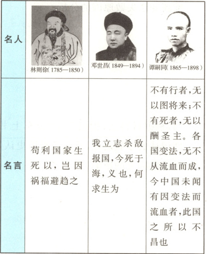 11.A 【解析】根据“共同时代诉求”并结合所学可知,林则徐、邓世昌、谭嗣同的名言讲的都是爱国主义的内容,表达了人们挽救民族危亡,热爱祖国的情感,A项正确;三人中仅谭嗣同是资产阶级维新派代表,主张实行君主立宪,排除B项;林则徐、邓世昌是清政府官员、地主阶级代表,不可能主张发展资本主义,排除C项;题干没有涉及三人对专制制度的看法,排除D项。故选A项。