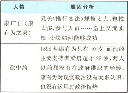 (2)康广仁认为变法规模太大、涉及人员太多且皇上无实权导致失败;徐中约认为康有为和梁启超年轻且缺乏政治经验,对现实政治认识不足是变法失败原因。