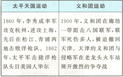 B【解析】根据材料和所学知识可知,太平天国运动中李秀成率军击败洋枪队,击毙洋枪队头目华尔;义和团运动在廊坊一带阻击八国联军,在老龙头火车站与侵略军激战,都沉重打击了外国侵略势力,B项正确;《天朝田亩制度》具有空想色彩,《资政新篇》也未能真正实施,都没有切合当时中国的实际情况,且义和团运动没有提出明确的革命纲领,排除A项;“扶清灭洋”是义和团运动的口号,太平天国运动没有提出这一口号,排除C项;太平天国运动的目的是推翻清朝统治,排除D项。故选B项。