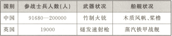 1. 下表是鸦片战争期间中英双方军事力量对比表。这从侧面反映出鸦片战争清政府失败的原因是(