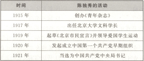 (1)材料一中陈独秀的活动反映了中国近代哪些重大历史事件?请任选其中一个历史事件,用一句话阐述其影响。(4分)