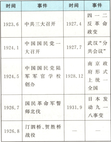 (2)选取事件:中国国民党第一次全国代表大会召开、国民革命军誓师北伐、四一二反革命政变、武汉“分共会议”。