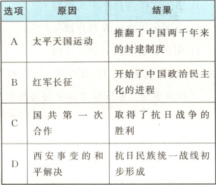 11.D 【解析】结合所学知识可知,西安事变的和平解决,揭开了国共两党由内战到联合抗日的序幕,成为扭转时局的关键,从此,十年内战基本结束,抗日民族统一战线初步形成,D项正确;太平天国运动最终失败,并没有推翻中国两千年来的封建制度,排除A项;戊戌变法,开始了中国政治民主化的进程,而不是红军长征,排除B项;国共第二次合作,取得了抗日战争的胜利,而不是国共第一次合作,排除C项。故选D项。