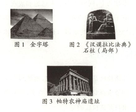 (2)建筑成就:图1 图3 历史信息:金字塔是古埃及文明的象征,反映了古埃及社会经济发展的较高水平,是古埃及人智慧的结晶,也反映了古埃及国王的无限权力;《汉谟拉比法典》是古巴比伦王国留给人类的宝贵文化遗产,表明人类社会的法制传统源远流长;希腊的建筑艺术对后世的建筑风格产生深远影响,雅典帕特农神庙就是其典型代表。