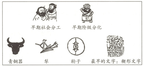 11.B 【解析】根据图片信息可知,两河流域出现了文字、社会分工、阶级分化等,且农耕技术得到发展,这体现了两河流域已经进入文明时代,B项正确;“形成统一帝国”从材料中无法得出,排除A项;材料不涉及对比信息,不能体现“文学艺术领先世界”,排除C项;材料没有体现种姓制度,排除D项。B项正确。