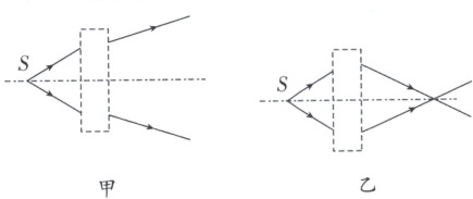 1. 如图所示虚线方框内各放置一个透镜,发光点$S$发出的两束光通过透镜前后的方向如图所示,若甲、乙透镜的焦距分别为$f_{甲}$、$f_{乙}$,且$S$点距甲、乙两透镜的距离相等,下列说法正确的是(