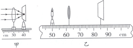 1. 小明同学用图甲所示的装置测出凸透镜的焦距,并探究凸透镜成像规律,当蜡烛、透镜、光屏位置如图乙所示时,在光屏上可成清晰的像。下列说法正确的是(