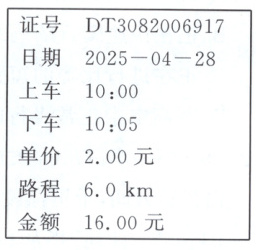 4. (情境化)小明乘坐出租车在平直公路上匀速行驶,到达目的地后,小明向司机索取了发票,如图所示。求: